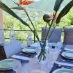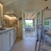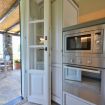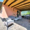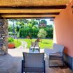 -Pergolato vista piscina con accesso diretto dalla cucina, composto da grande tavolo da pranzo e area relax con divanetti.